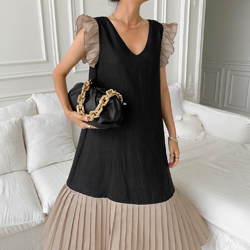 Vネックプリーツワンピース プリーツ フリルスリーブ 配色 ワンピース ドレス サマーワンピ プリーツドレス レディース オフィスコーデ デート a4228