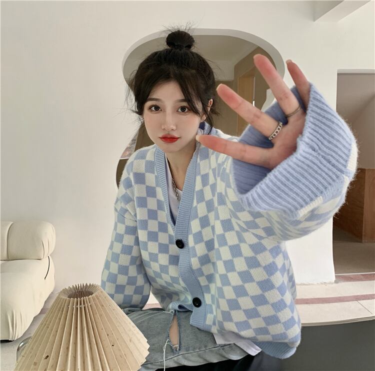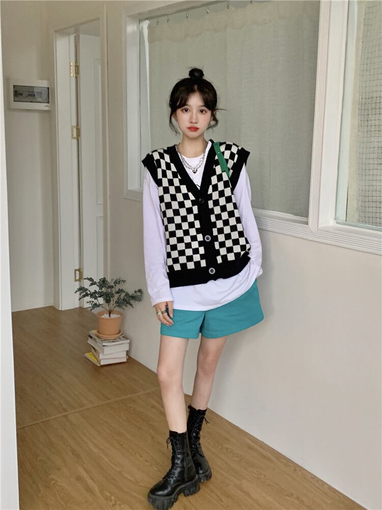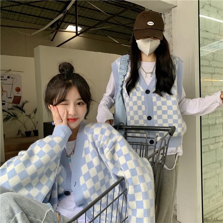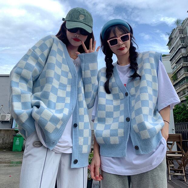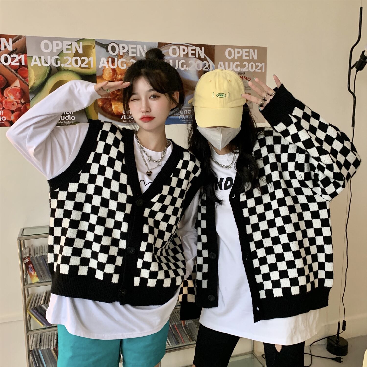【選べる2パターン】ニット ベスト カーディガン ブロックチェック Vネック 着映え お揃い 双子コーデ カジュアル ストリート 2カラー 2パターン a4242