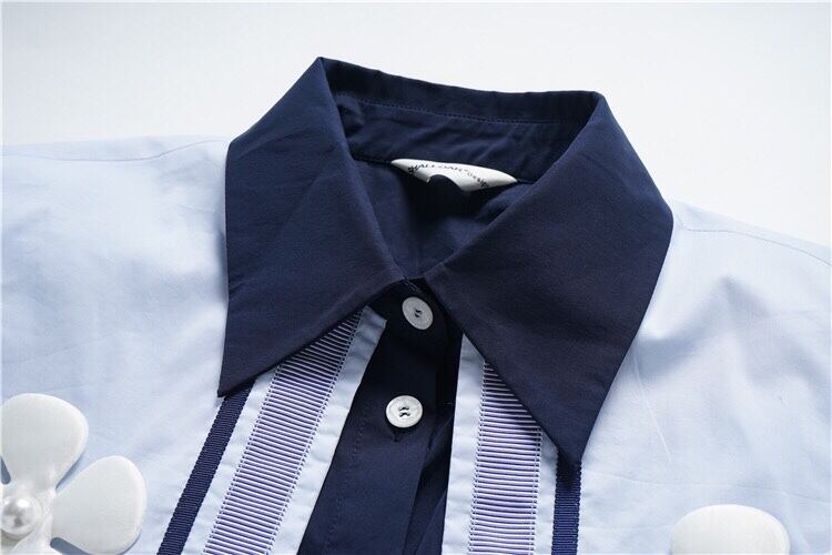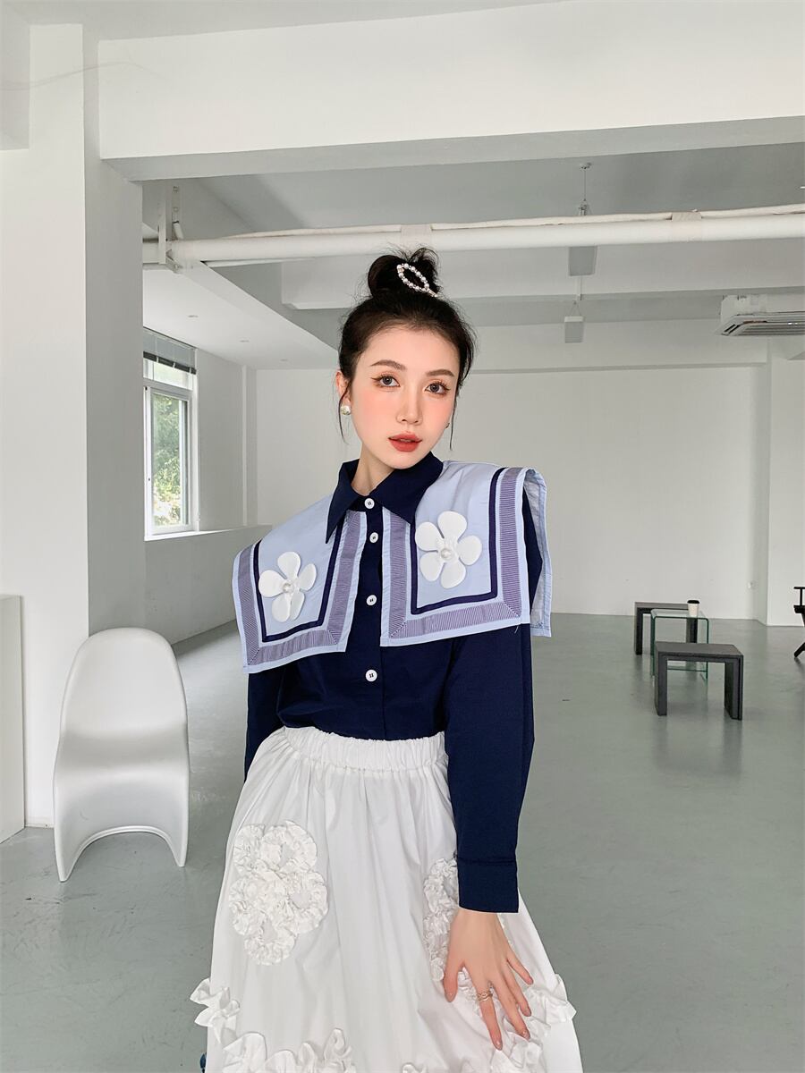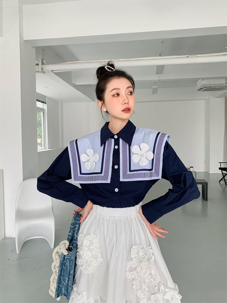 【バラ売り】立体フラワーネイビーシャツ 立体フラワーフリルスカート ブラウス フリルスカート トレンド レディース a4256
