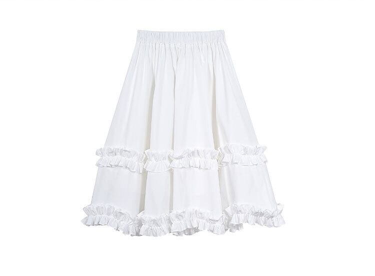 トレンドのビックカラーのネイビーシャツと立体フラワーとフリルが印象的なスカートです。