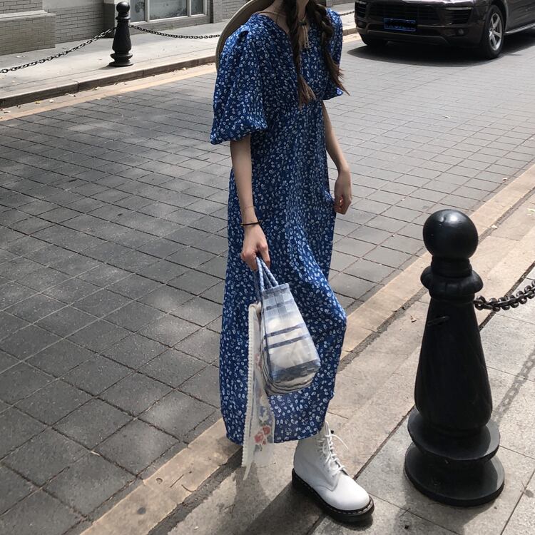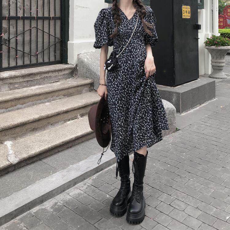 Vネックフラワーワンピース パフスリーブ 花柄 フローラルドレス ワンピース ドレス 半袖 レディース オルチャン a4258