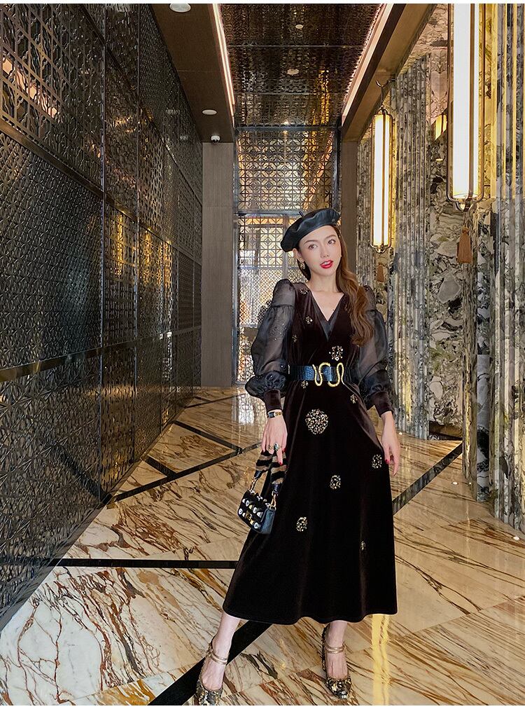 Vネックベルベットドレス シースルースリーブ 長袖 ワンピース ドレス ベルベット レディース パーティー お呼ばれ 綺麗 エレガント 刺繍 スパンコール a4276