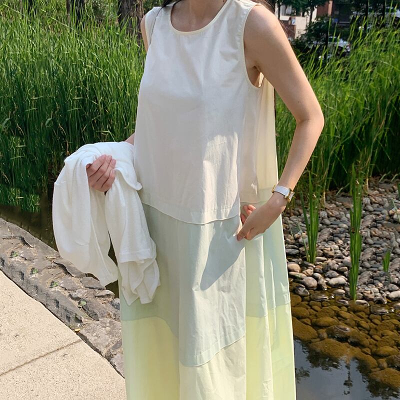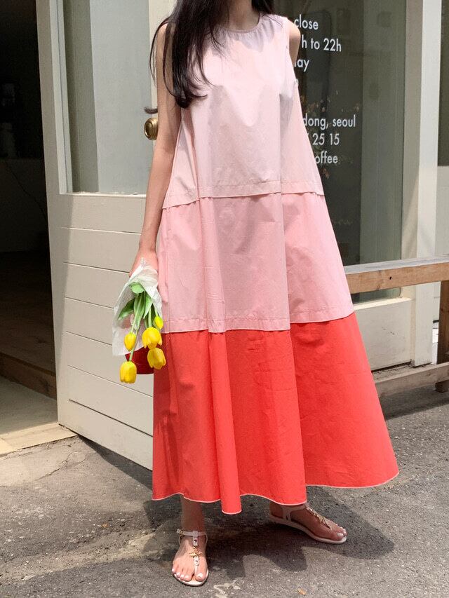 レイヤード ノースリーブワンピース バイカラー ティアードワンピース ノーカラー フレア マキシ丈 カジュアル ノースリーブ a4300