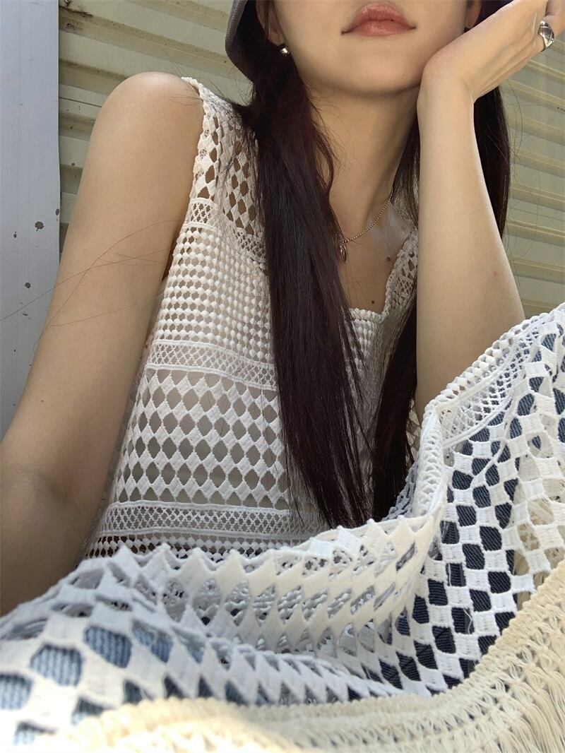 【2点セット】ノースリーブメッシュフリンジワンピース+タンクトップ