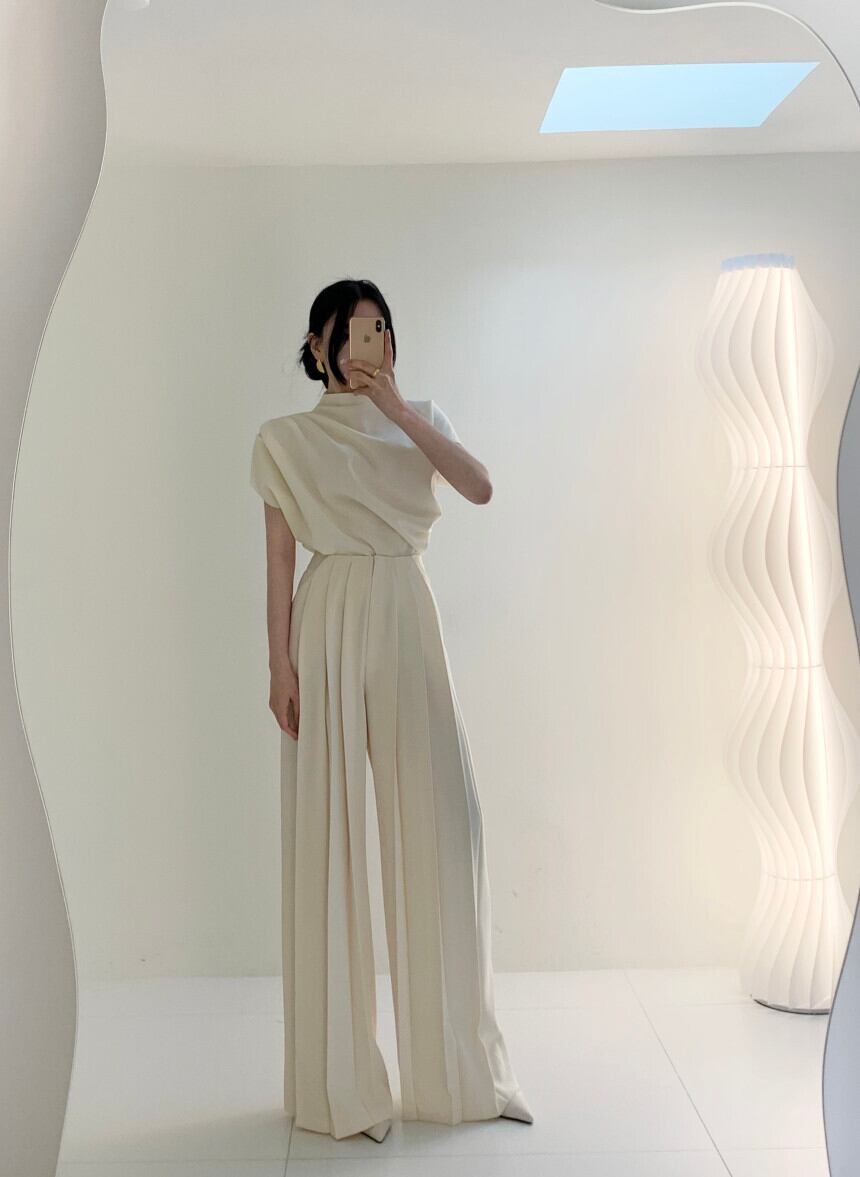 ボトルネックドレープブラウスorプリーツカジュアルワイドパンツ