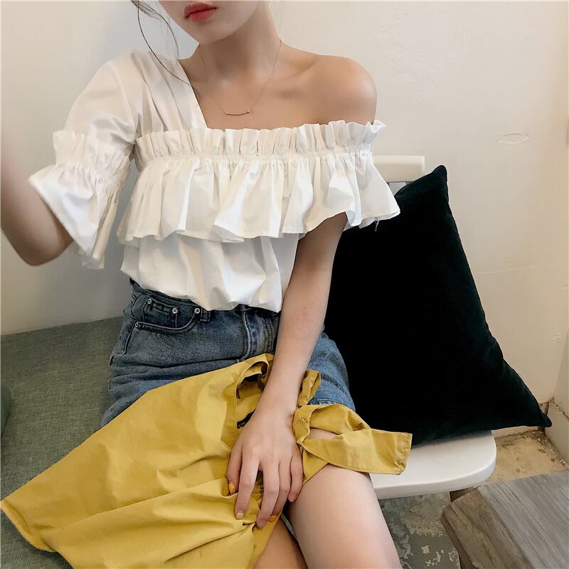 フリルデザイン ワンショルダー ブラウス 不規則 シャツ トップス カットソー チュニック オルチャン 韓国. レディース 夏 春 かわいい シフォントップス 2カラー a4342