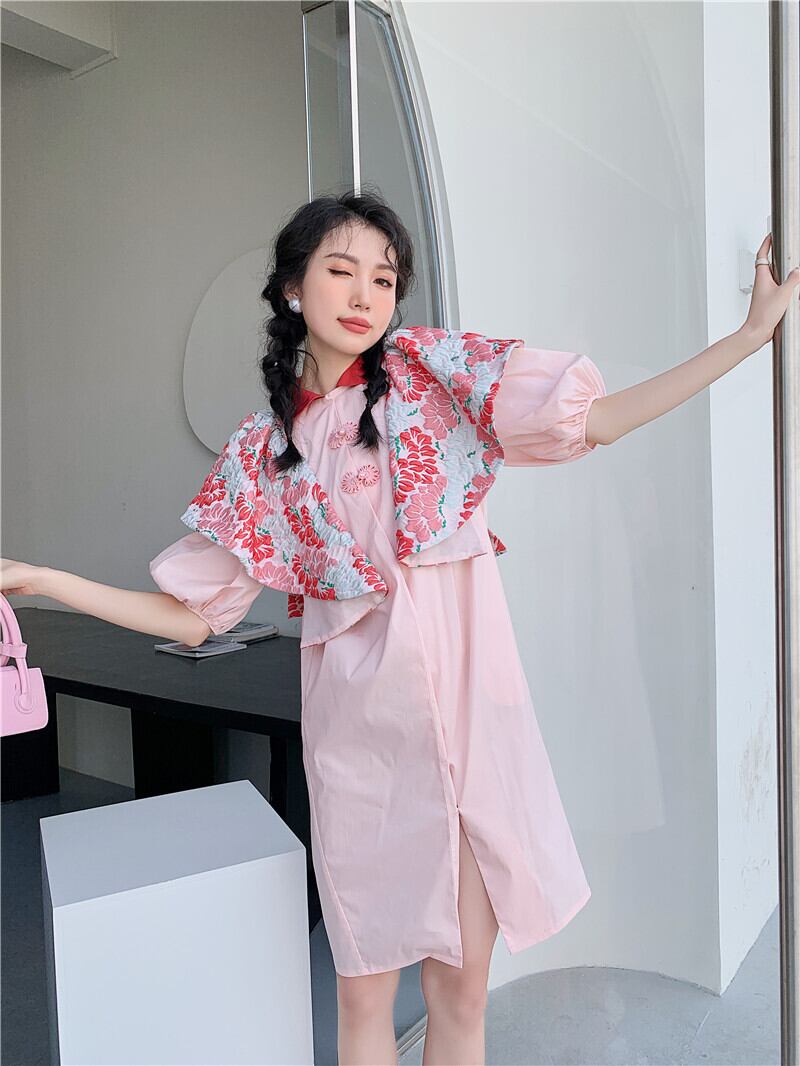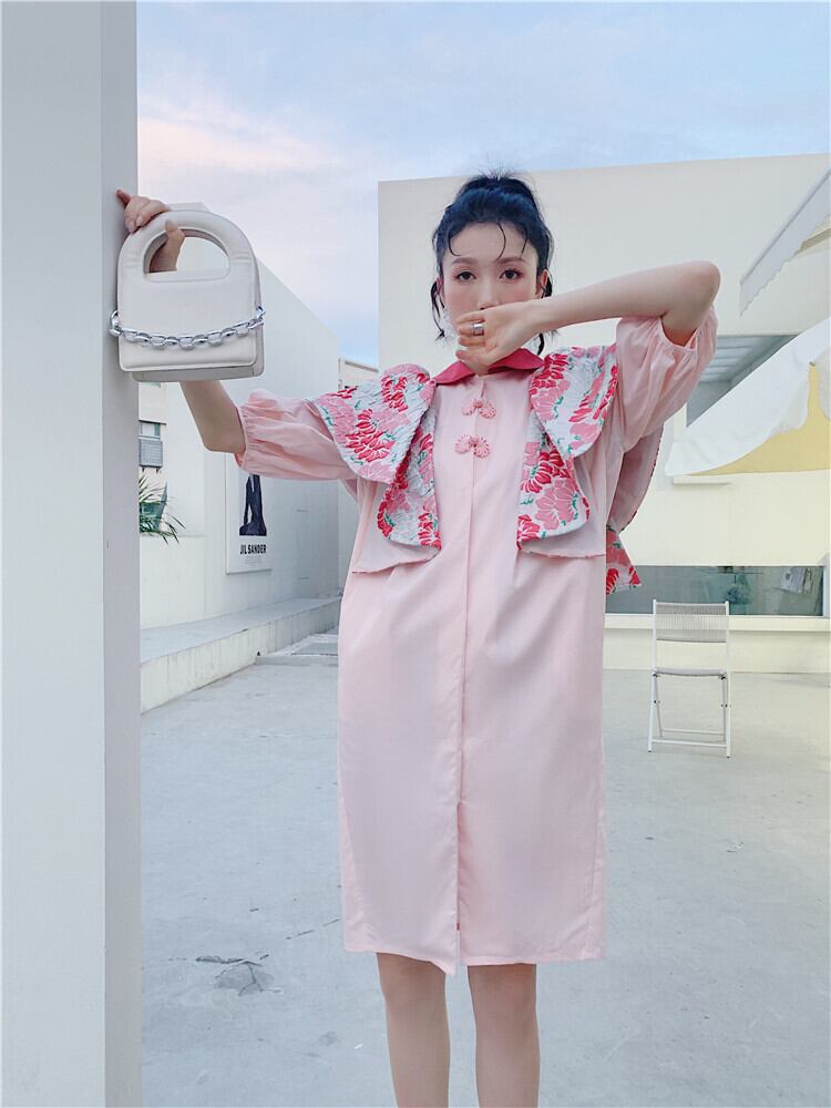 BIGフラワーカラー シャツワンピース ピンク ワンピース ドレス シャツ 膝丈 レディース オフィス デート. 可愛い パフスリーブ C86