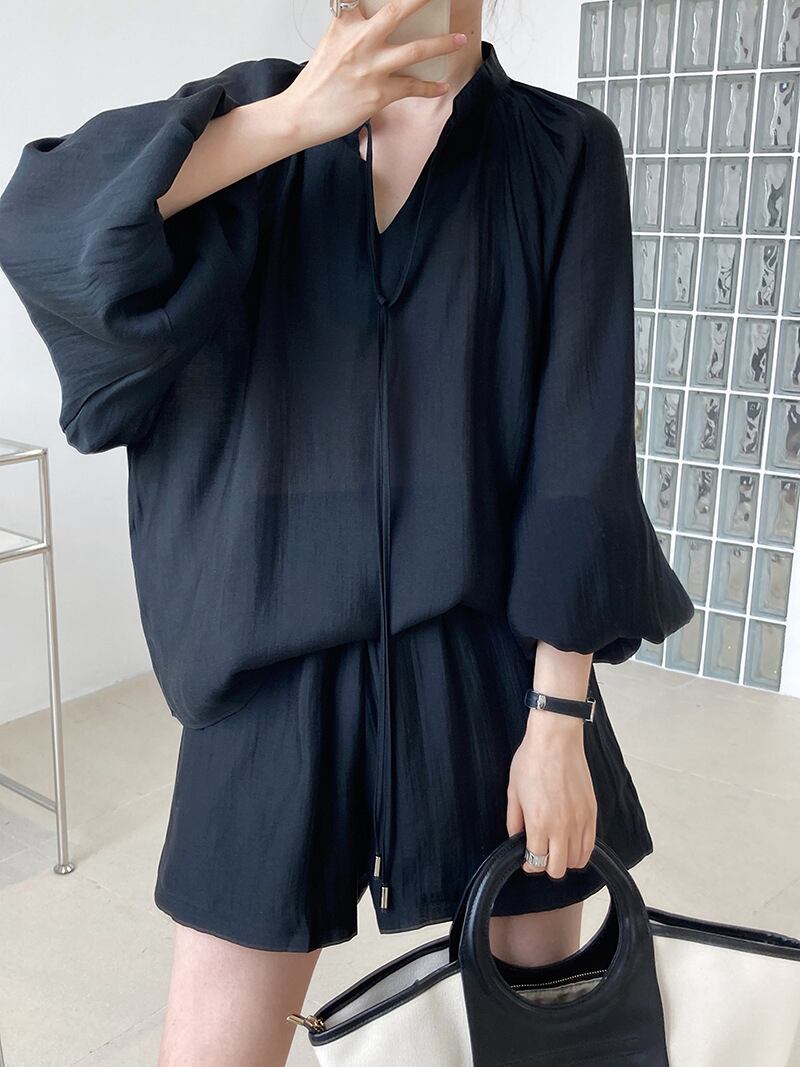 【セットアップ】Vネックブラウス+ハーフパンツ シアー感 上下セット ツーピース テンセル ブラウス ショートパンツ オシャレ. 夏 ママコーデ カジュアル お出かけ 大人 かっこいい レディース 3カラー a4371
