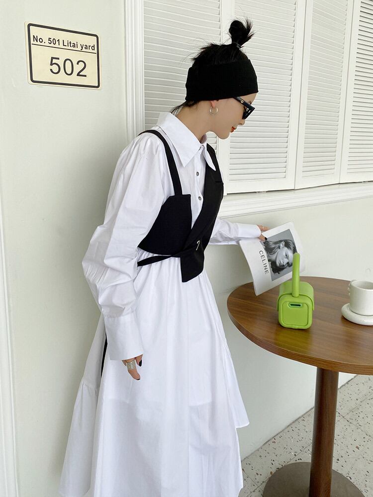 【セット】不規則ロングシャツワンピース+スタラップベスト シャツワンピース ベスト ツーピース 2点セット モード系 オシャレ 2カラー a4379