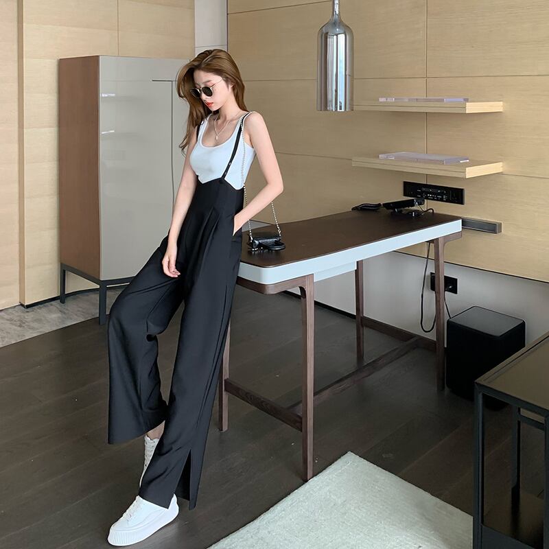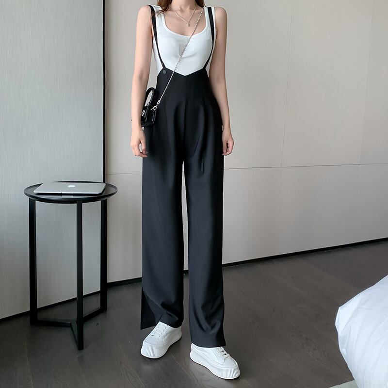 ハイウエスト サロペット スリット ワイド パンツ サスペンダー ゆったりカジュアルサロペットパンツ a4398