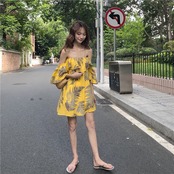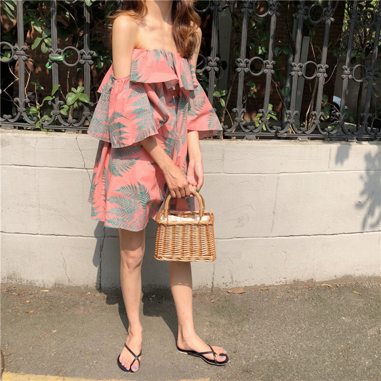 リーフ柄 チューブトップフリルワンピース オフショルダー ミニワンピース ワンピース フリルワンピ フリル 半袖 春夏 サマードレス レディース 2カラー a4401