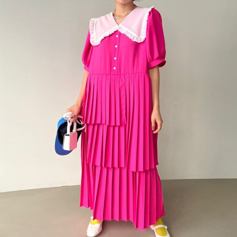 ビビッドカラー プリーツワンピース ロングワンピース スイート 切り替 ゆったり プリーツ ボタン 半袖 レディース ワンピース 4カラー a4405
