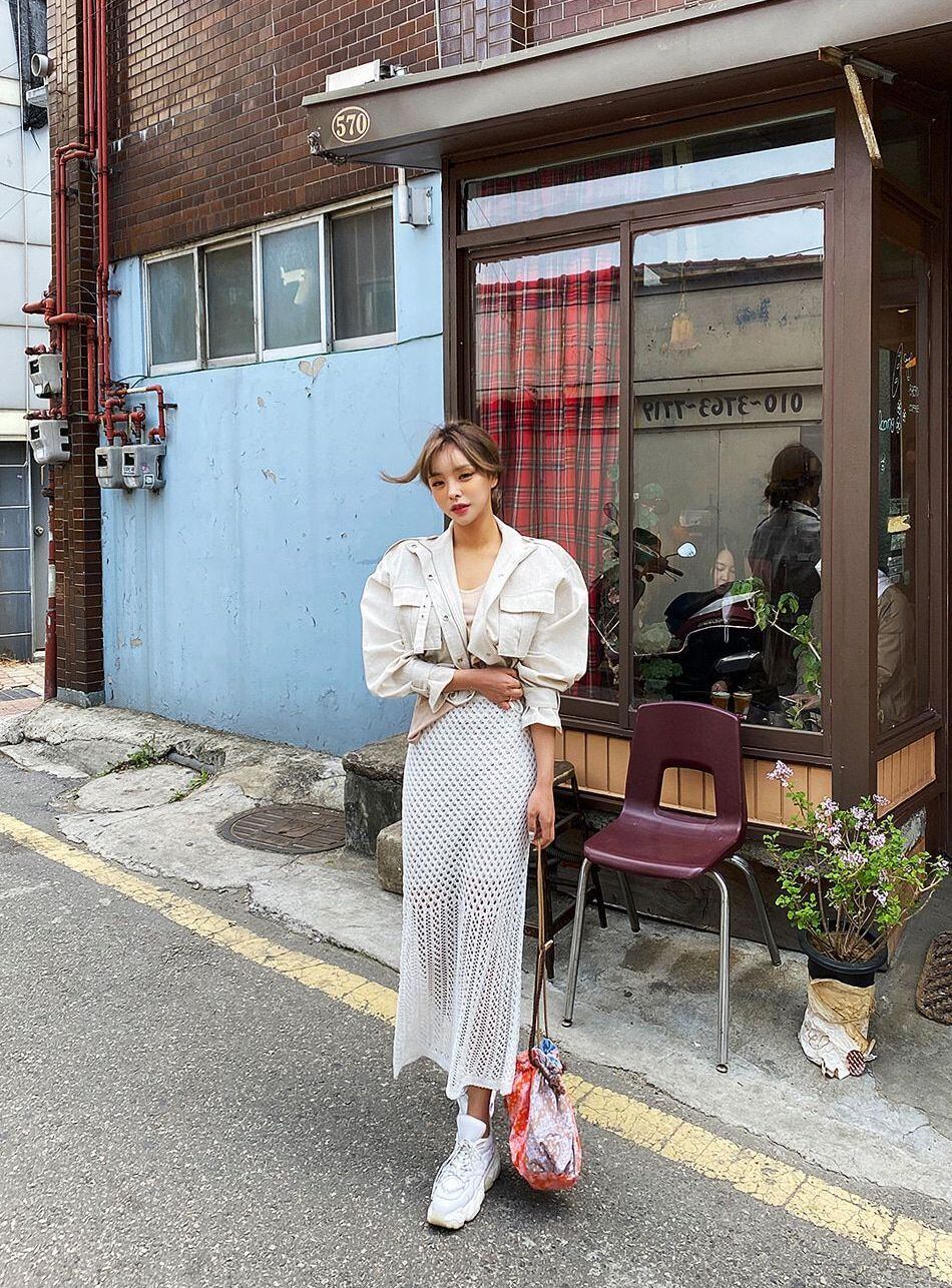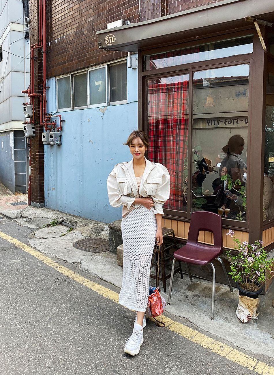 全体をクロシェ編みでシアー感のある風合いに仕立てたペンシルスカートです。\スリット入りなのでフットワークにストレスがなく、動く度にひるがえる裾のニュアンスがセンシュアルで大人っぽい雰囲気を漂わせます。