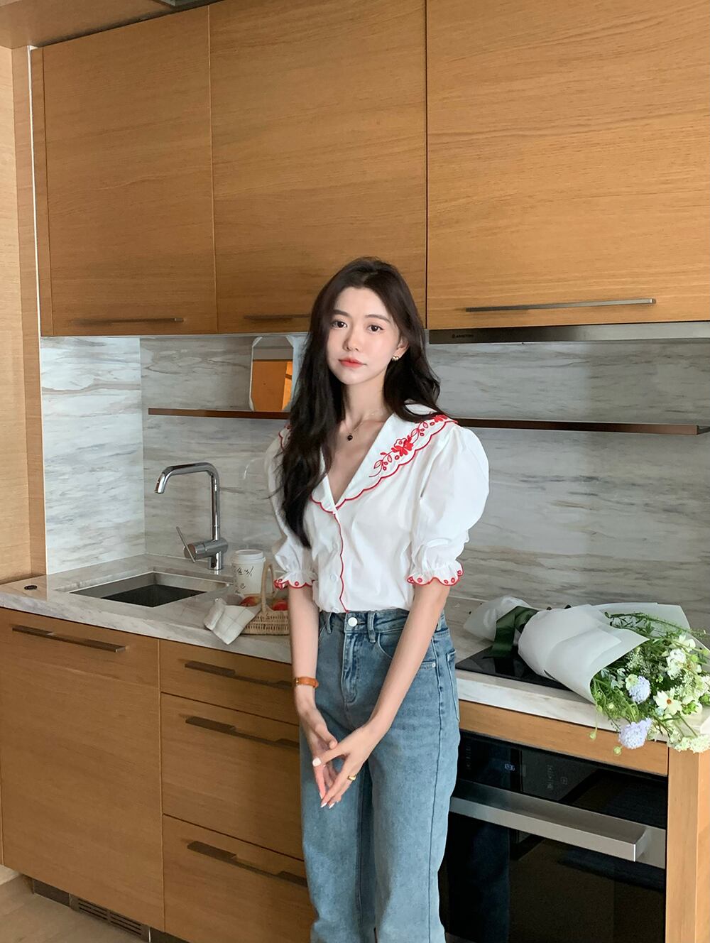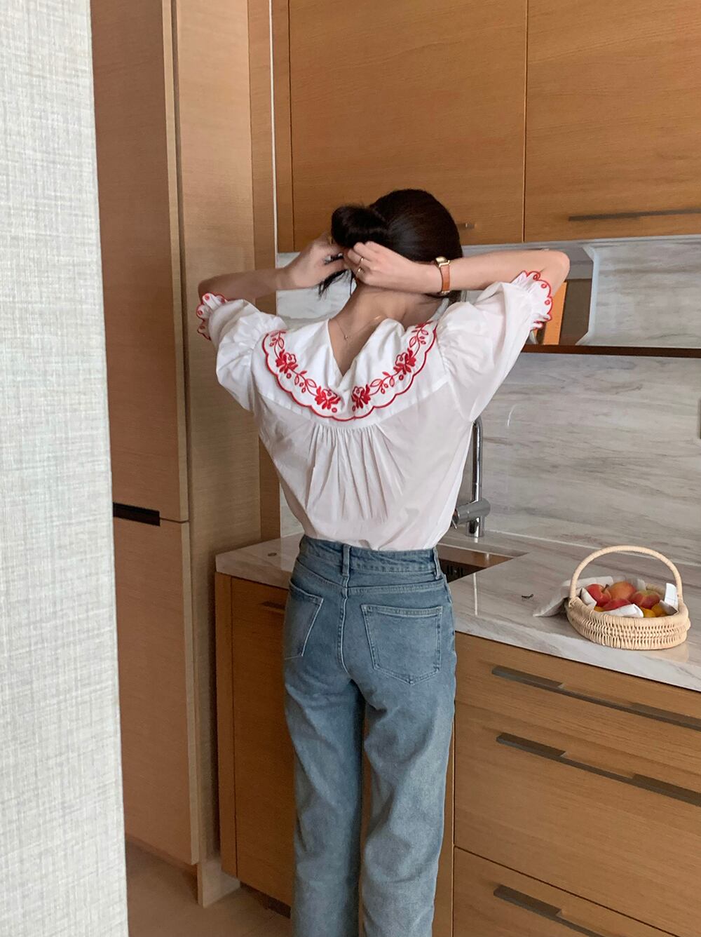 フラワー刺繍半袖シャツ ブラウス シャツ 半袖 刺繍 レディース かわいい Vネックブラウス ガーリー カラーウェーブ パフスリーブ C135