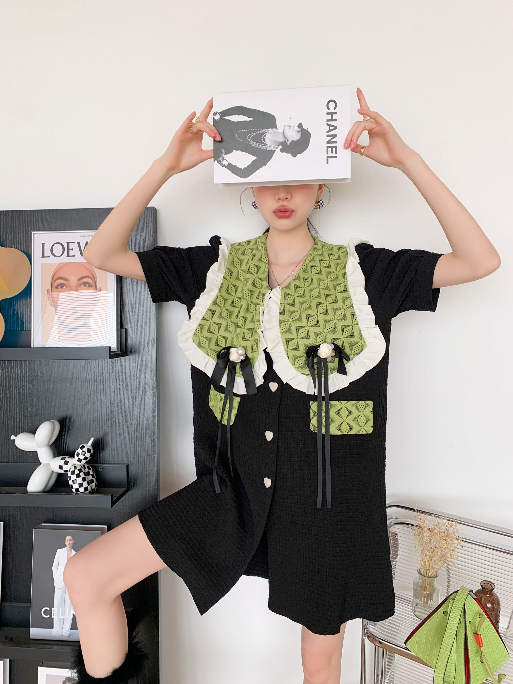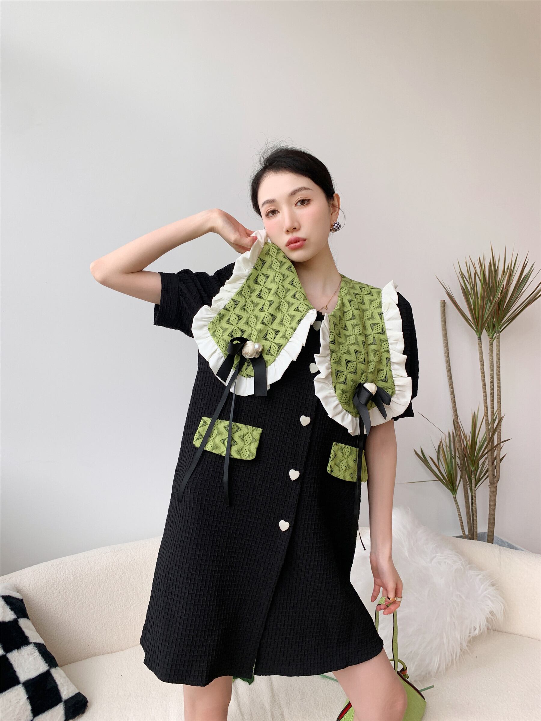 ドールカラーフレンチヴィンテージワンピース ドレス ワンピース 半袖ワンピース ニッチデザイン レディース レトロ フレンチステッチ コントラストカラー フリル ボウシャツ スカート 個性派 モード系 a4428