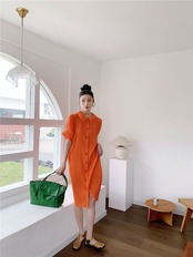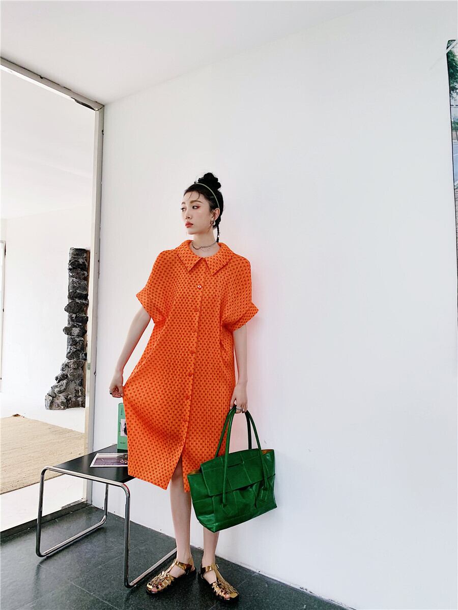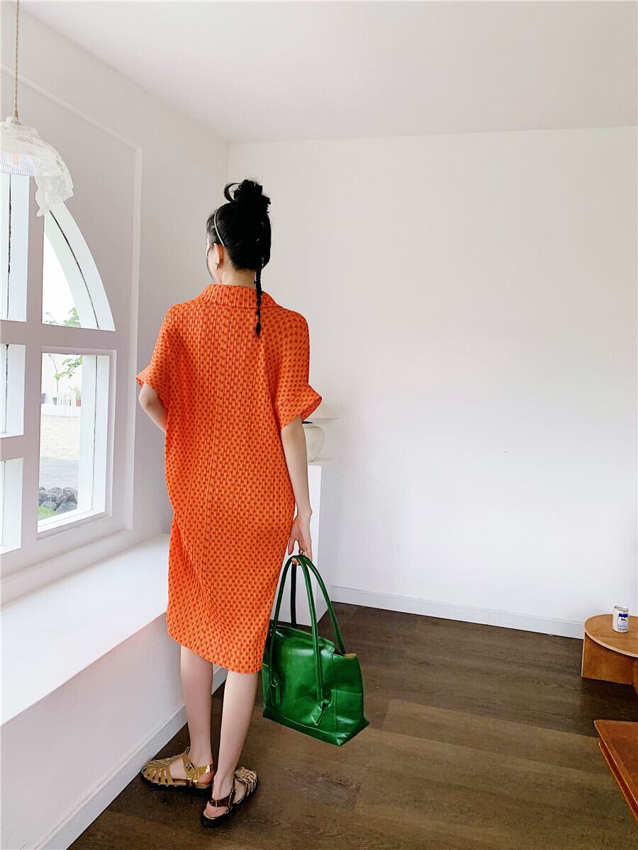 ドットプリントドレープシャツワンピース ドット柄 シャツワンピース オレンジ ワンピース ドレス 半袖ワンピース プルオーバー ママコーデ お仕事コーデ オフィスコーデ a4436