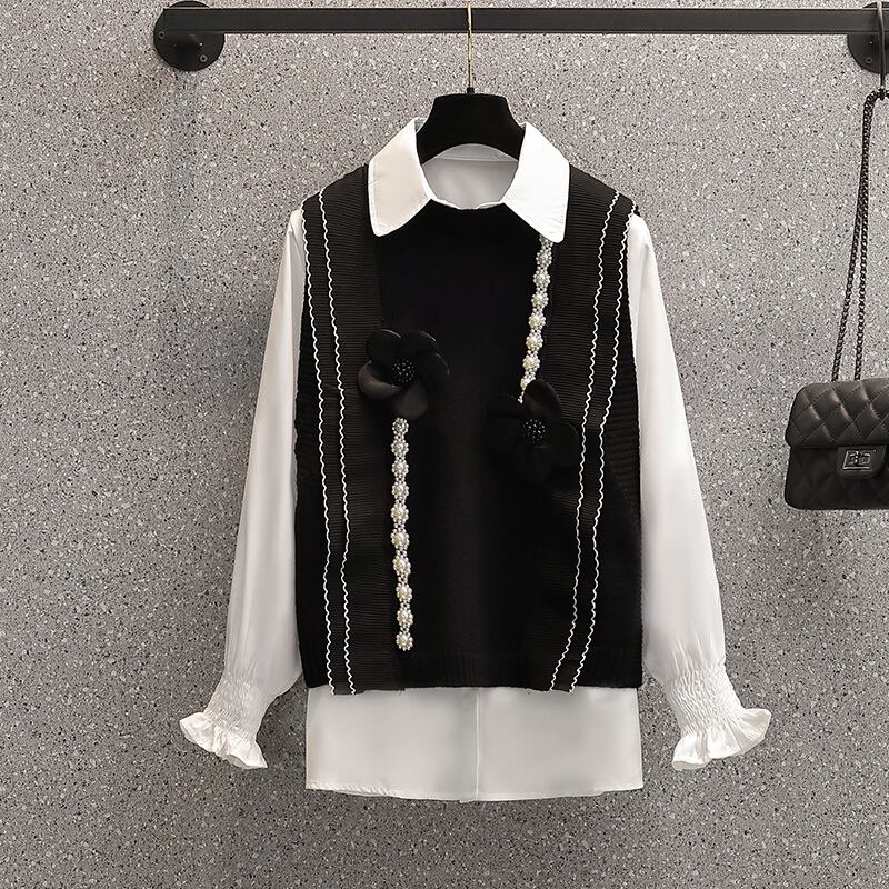 【2点セット】立体花ビーズニットベスト+シャツ ニットベスト 長袖 シャツ ブラウス ニット ベスト 2点セット プルオーバー 秋冬 トップス レディース ルーズ 韓国 オルチャン ニット オフィスコーデ ママコーデ デートコーデ オシャレ C103