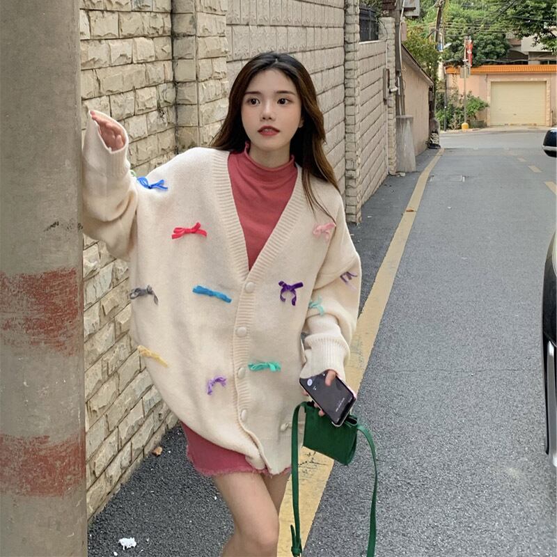 【大きいサイズあり】リボン付き Vネックニットカーディガン ニットカーディガン ニット セーター カーディガン ジャケット アウター オルチャン オーバーサイズ 韓国 レディース 可愛い 3カラー C106