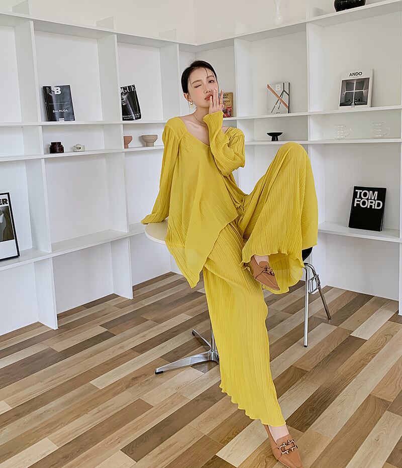 【セットアップ】イエロー Vネック プリーツ 長袖トップス+プリーツ ワイドパンツ