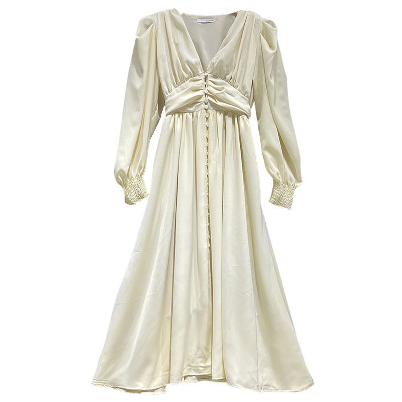 Vネックフレンチワンピース パフスリーブ ロングワンピース シフォンワンピース スリムウエスト ワンピース ドレス 長袖ワンピース フレンチ 大人綺麗 パーティー お呼ばれコーデ デートコーデ オフィスコーデ. レディース C113