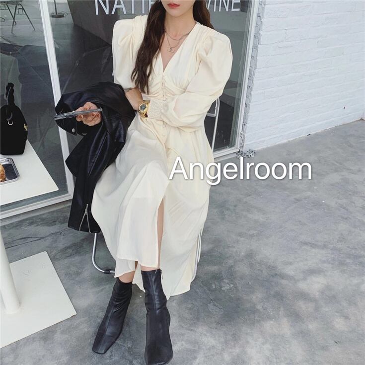 深めのVネックに大きめパフスリーブがオシャレなフレンチワンピース