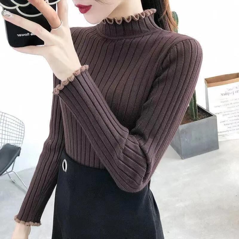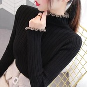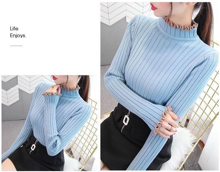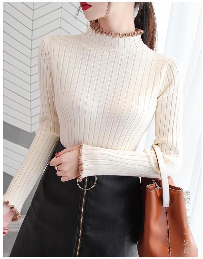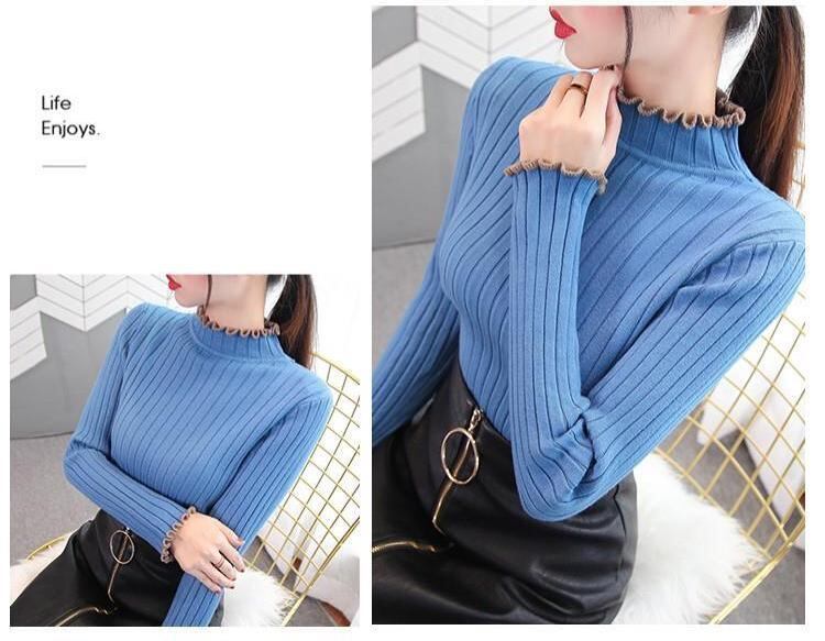 長袖ニット セーター リブ レディース ハイネック フリル タイト スリム 無地 シンプル カジュアル 上品 暖かい 防寒 秋冬 プルオーバー トップス メロウフリル ホワイト ブラック ブルー ベージュ かわいい 可愛い おしゃれ お洒落 7カラー D25