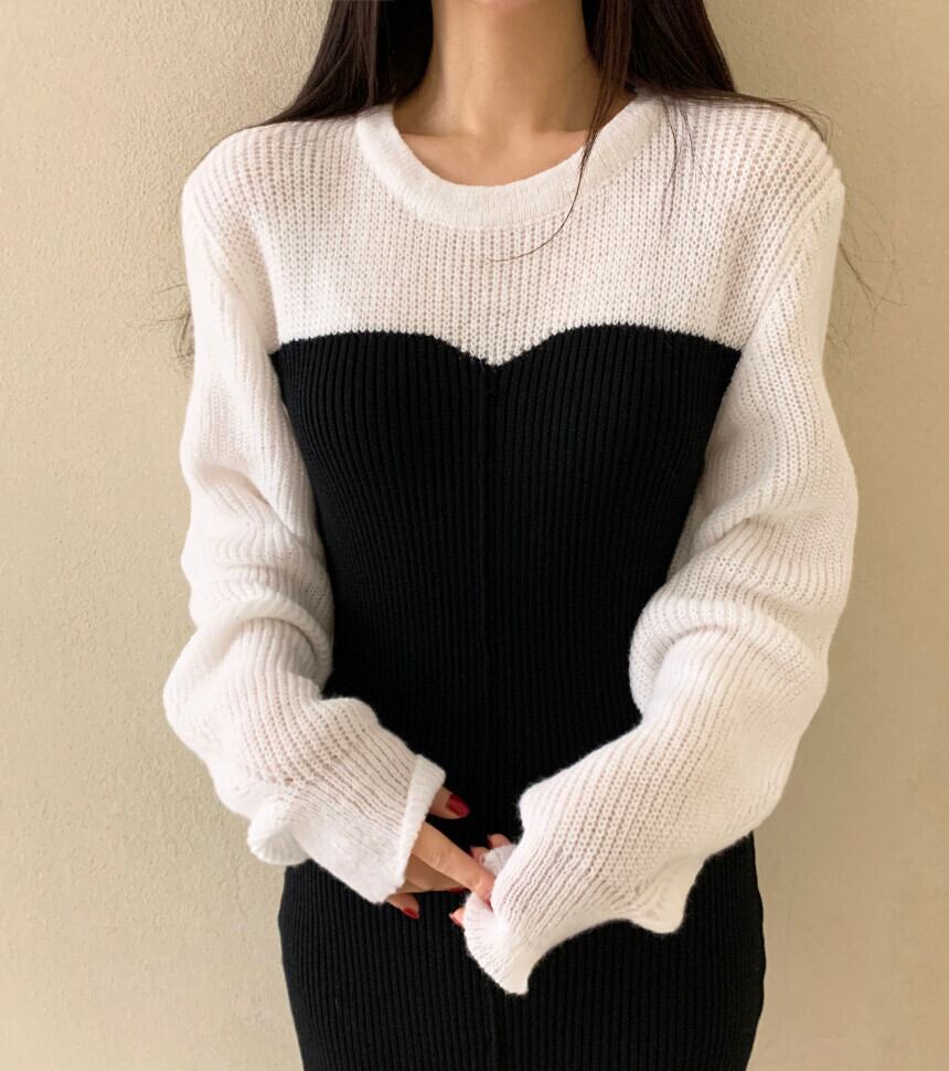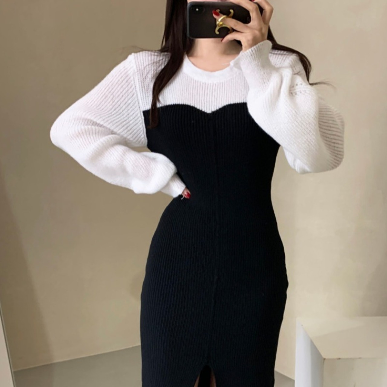 バイカラーニットワンピース ラウンドネック ニットワンピース スリム セーター ニット ドレス レディース ママコーデ デートコーデ オフィスコーデ 綺麗め 上品 a4534