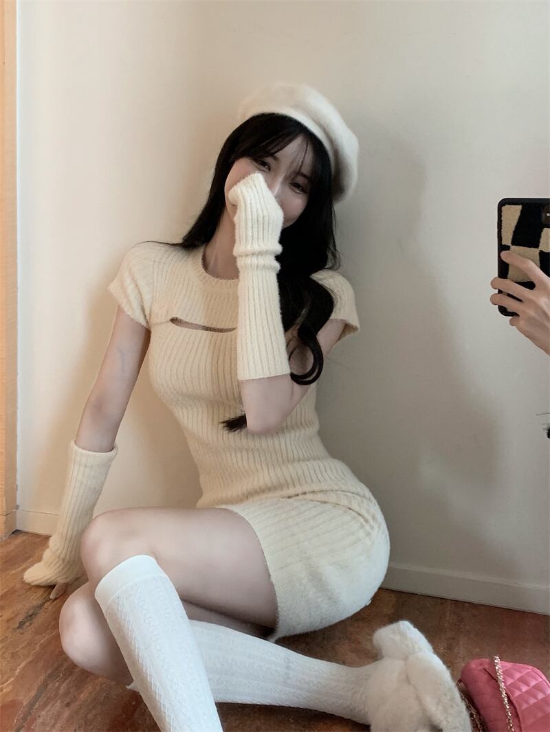 アームスリーブ付き ニットミニワンピース ミディアム丈 膝上丈 ミニワンピ ニットワンピース + アームカバー 春秋 ストレッチ タイトスカート 無地 ミニワンピ D75