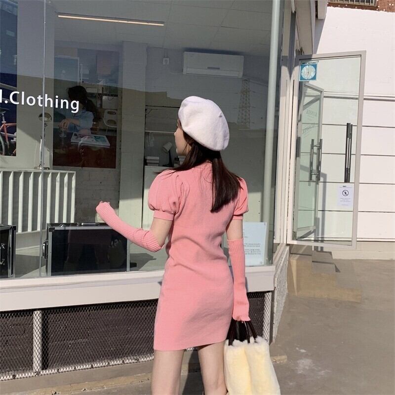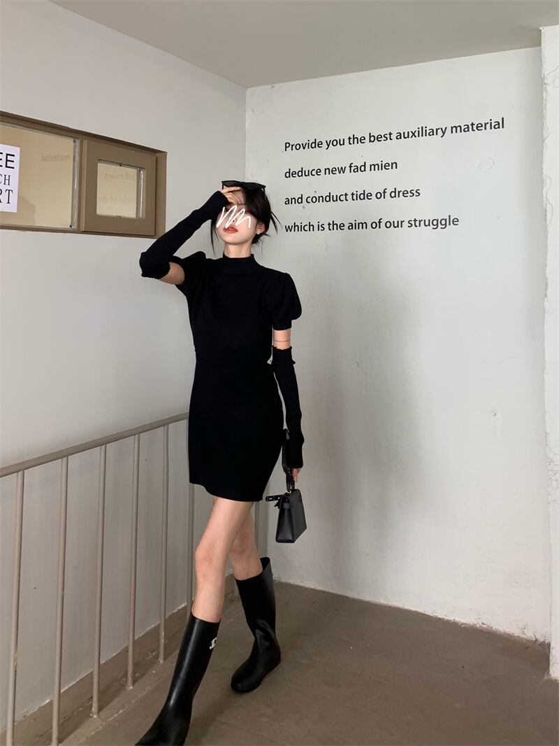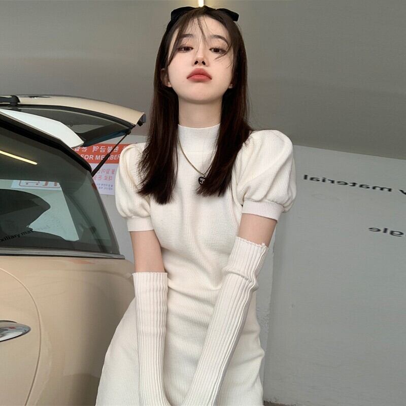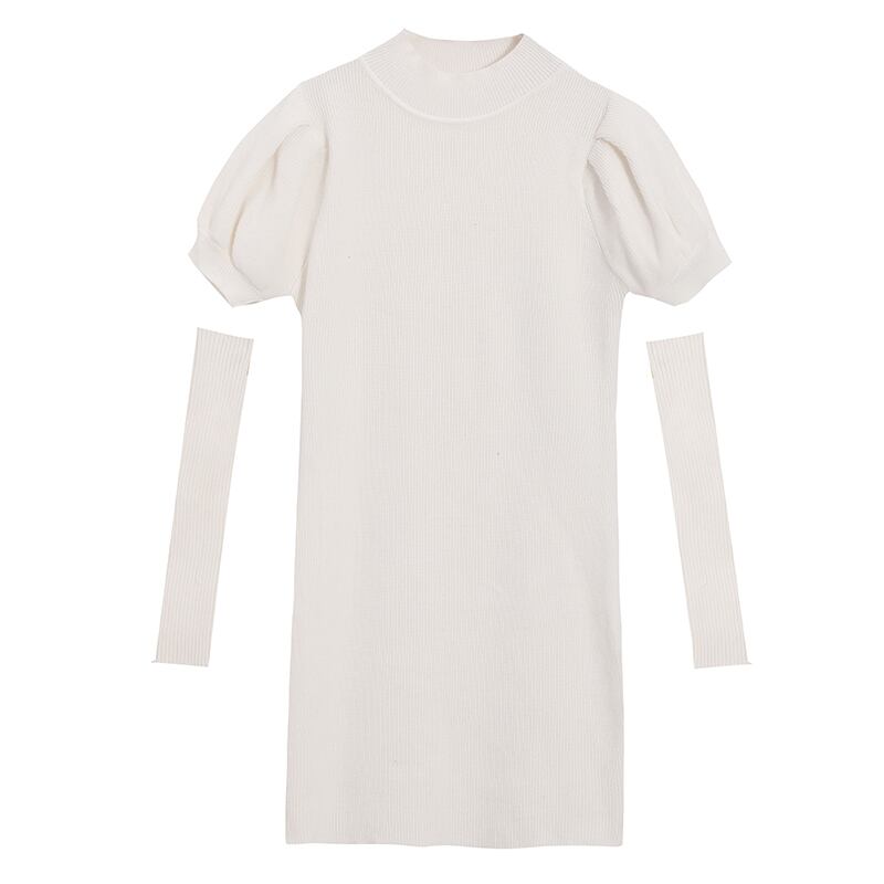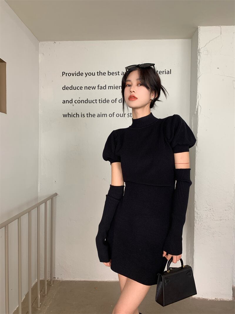 アームスリーブ付き ニットミニワンピース ミディアム丈 膝上丈 ミニワンピ ニットワンピース + アームカバー 春秋 ストレッチ タイトスカート 無地 ミニワンピ D77