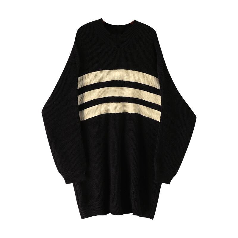 ボーダー柄 ニット セーター トップス ミディアム丈 袖あり 長袖 ドロップショルダー 萌袖 ラウンドネック 襟なし リブ リブニット かわいい 大人可愛い カジュアル 大人 おしゃれ お洒落 大人女子 こなれ感 ルーズ 個性的 モード系 柄 格子柄 春 秋 冬 10代 20代 レディース 通勤 学生 通学 デート お出かけ 女子会 休日 旅行 着回し 普段使い 重ね着 韓国 韓国系 オルチャン 暖かい ゆったり D86