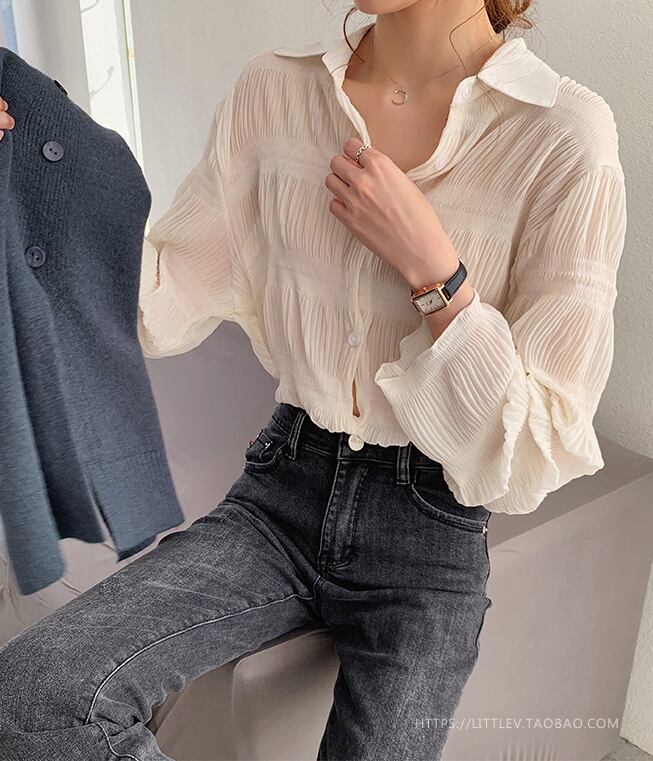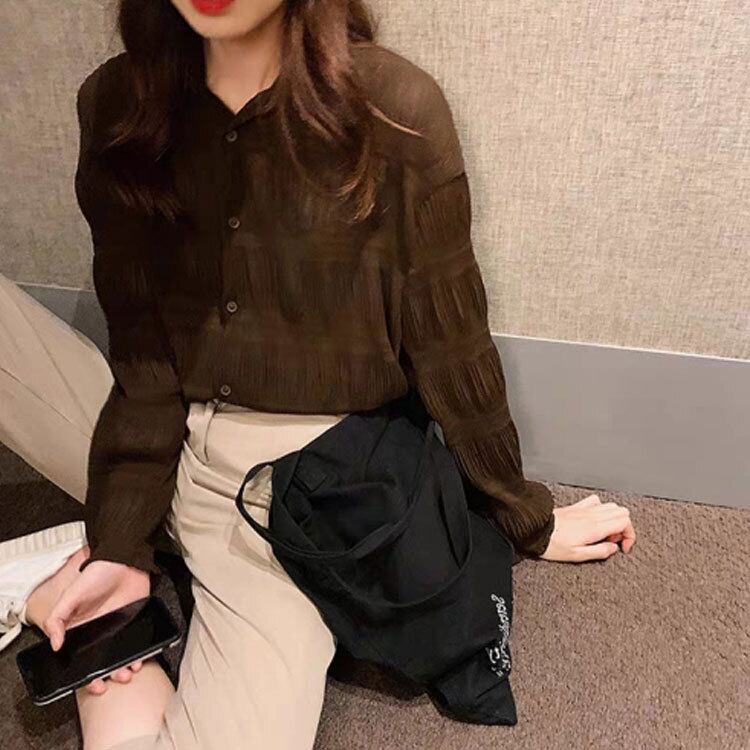 シアーギャザーブラウス シースルー 薄手 レディース 長袖シャツ 重ね着 肌透け フェミニン 冷房対策 プリーツ シャツ 透け感 フリル オシャレ 体型カバー 春 夏 秋 冬 通勤 ママコーデ. オフィスコーデ 2カラー a4490