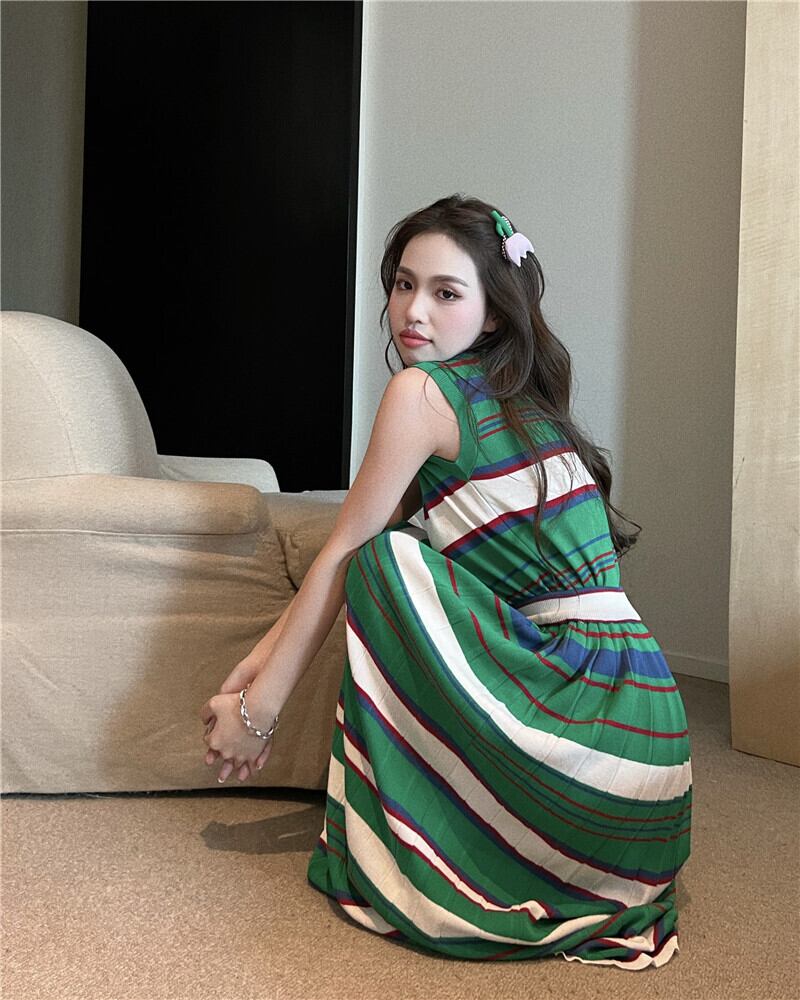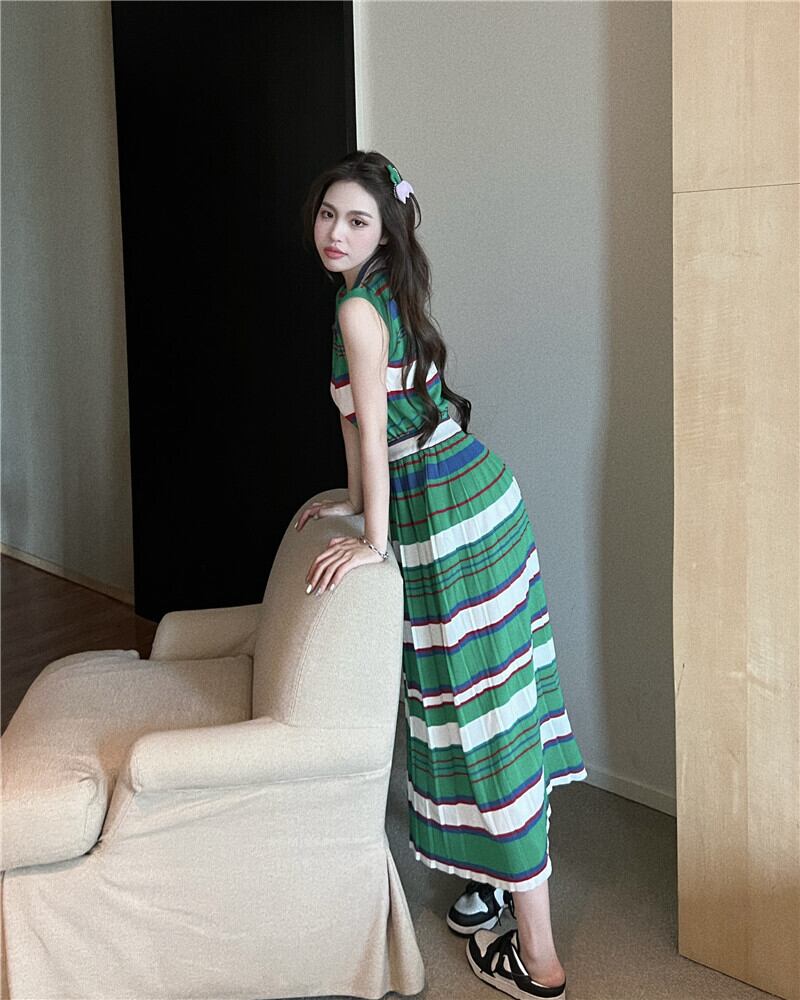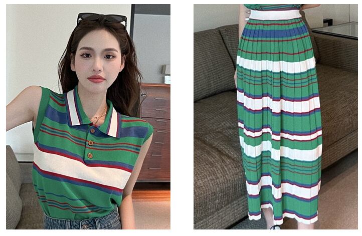 【セットアップ】ストライプ ノースリーブトップス+ミドル丈プリーツスカート 2点セット. 上下セット コントラストカラー ツーピース ニットアップ. レディース プリーツスカート ボーダー オフィスコーデ ママコーデ デート 10代 20代 30代 可愛い. C177