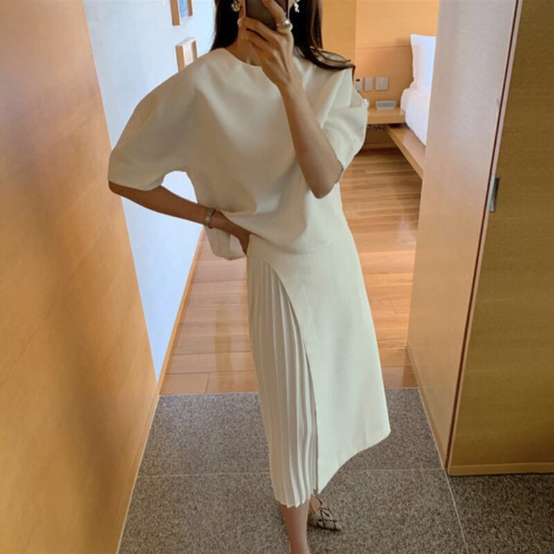 【セットアップ】パフスリーブトップス+サイドプリーツスカート ツーピース set up 上下セット カットソー プリーツスカート レディース エレガント ラウンドネック ママコーデ. 通勤 オフィスコーデ 2カラー a4499