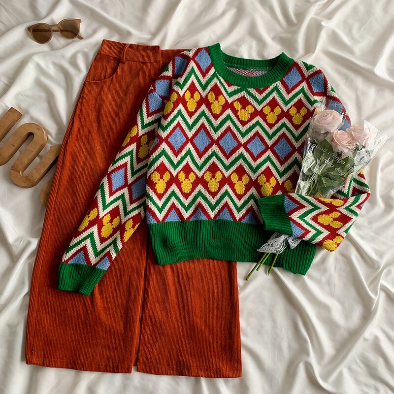 【セットアップ】カラーブロックニットセーター+コーデュロイスカート