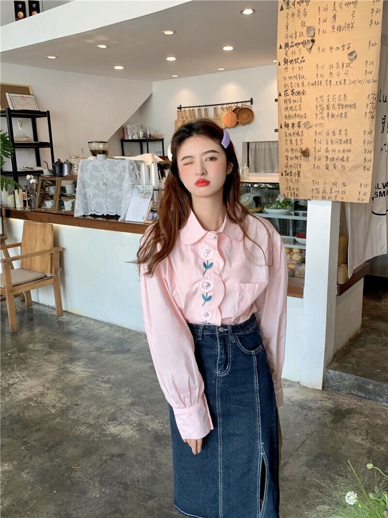 【大きいサイズあり】花柄刺繍シャツ 長袖 ブラウス シャツ ホワイト ピンク レディース トップス 刺繍 パールボタン オルチャン 通学 通勤 ママコーデ オフィスコーデ 可愛い 2カラー C241