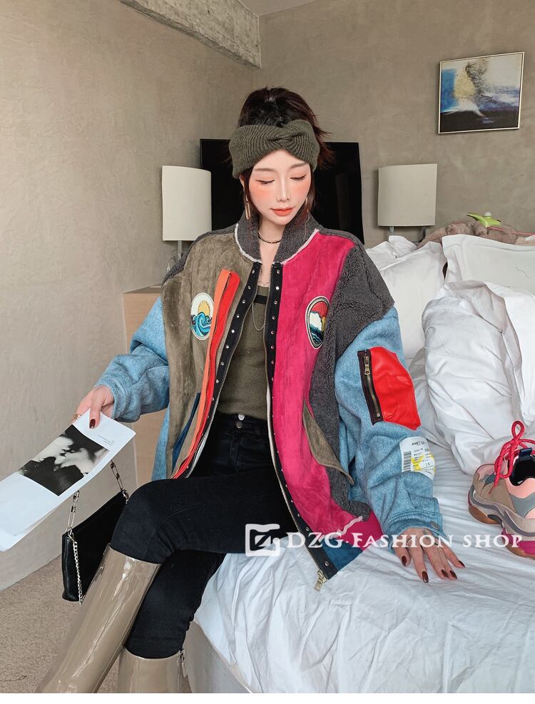 異素材MIXジャケット ボアジャケット デニムジャケット ウールコート トリコロールカラー ジャケット ブルゾン 厚手 ジャンパー コート レディース カジュアル ルーズ アメカジコーデ ストリート 10代 20代 30代 D235