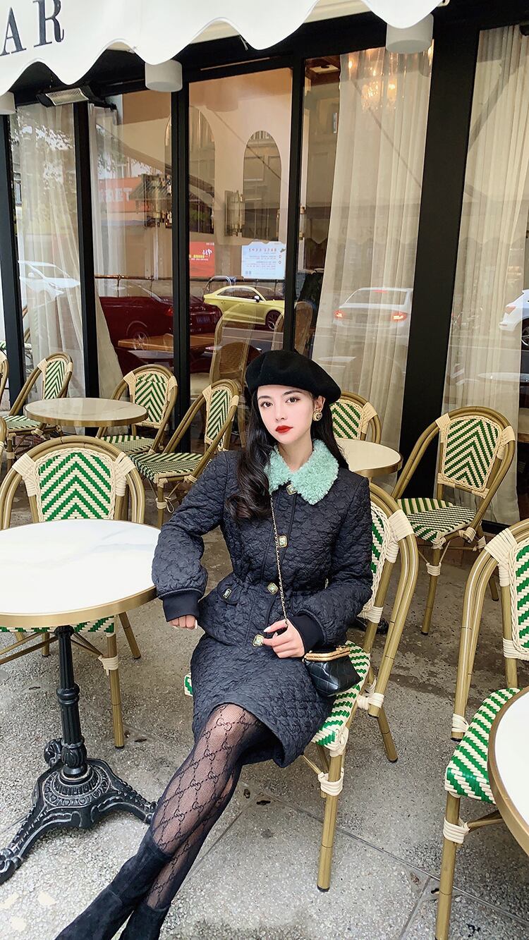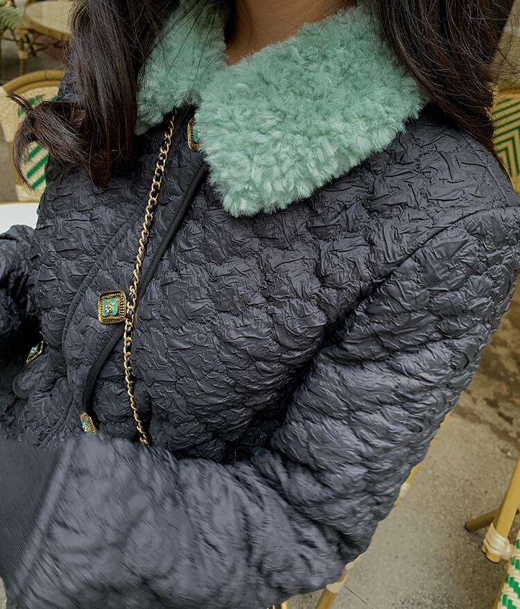 ファーの衿やボタンのティファニーブルーが黒のくすみを打ち破り、