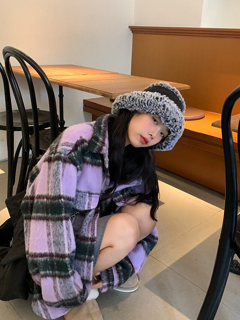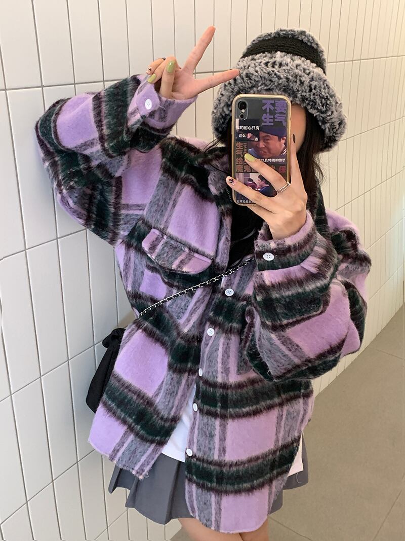 パープルチェック柄シャツジャケット ウールシャツ テーラードジャケット ショート丈 アウター レディース 厚手 シャギー チェック柄 ポケット ボタン かわいい カジュアル ガーリー お出かけ デート 通学 秋 a4556