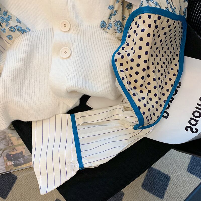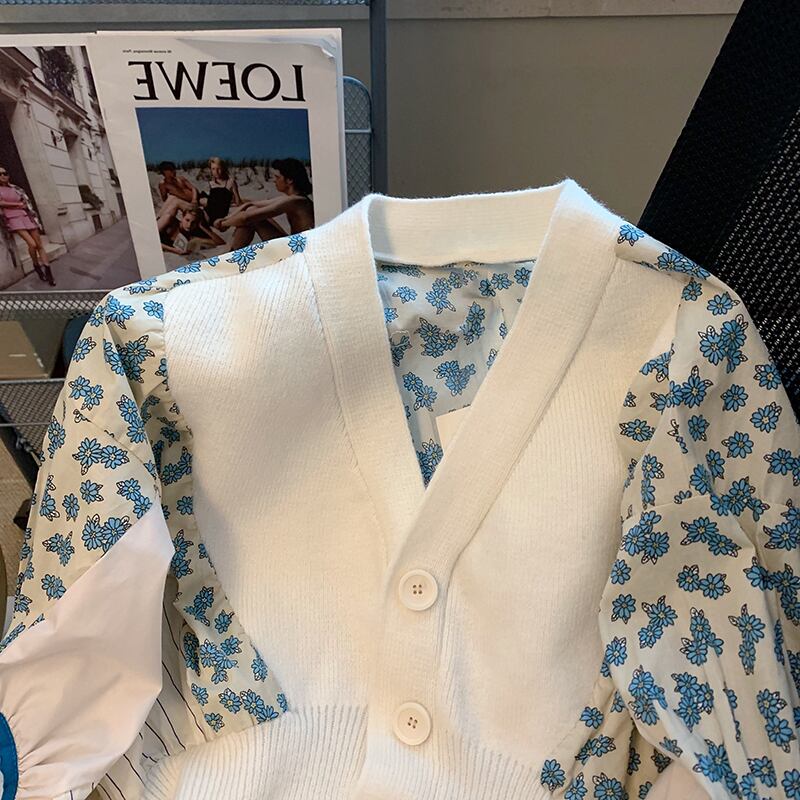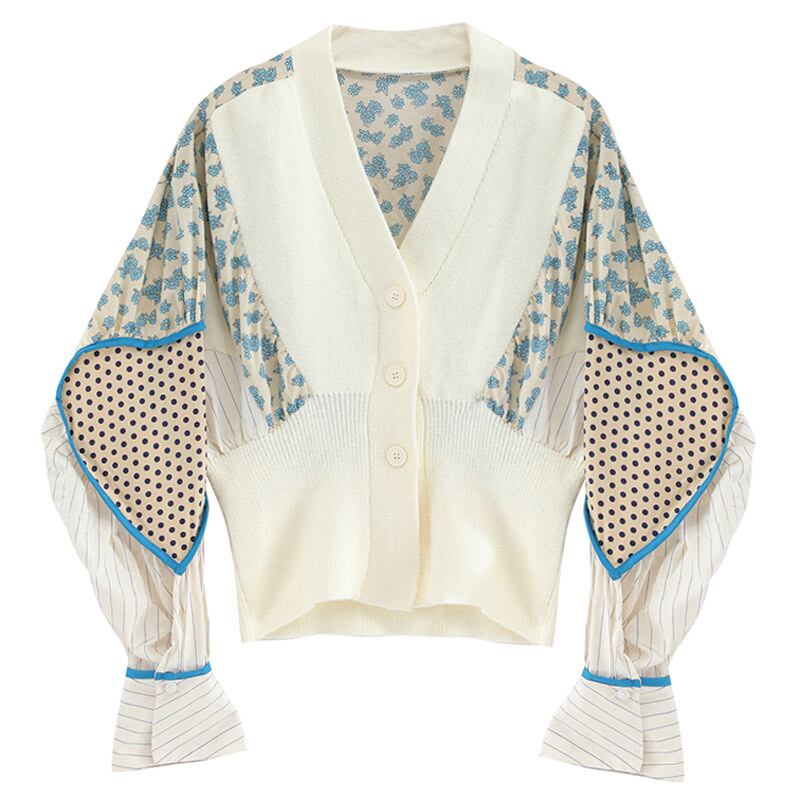 異素材カーディガン フローラルパッチワークVネックニットカーディガン シャツ ニットカーディガン ニット カーディガン ジャケット ガーリー モード系 ママコーデ オフィスコーデ 可愛い C221