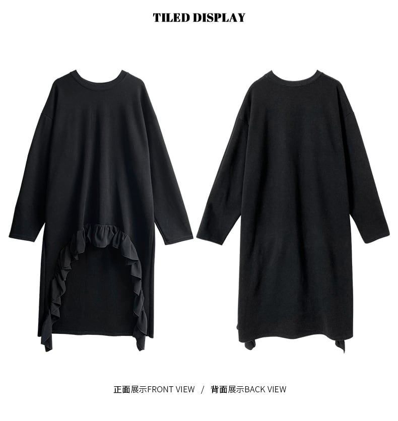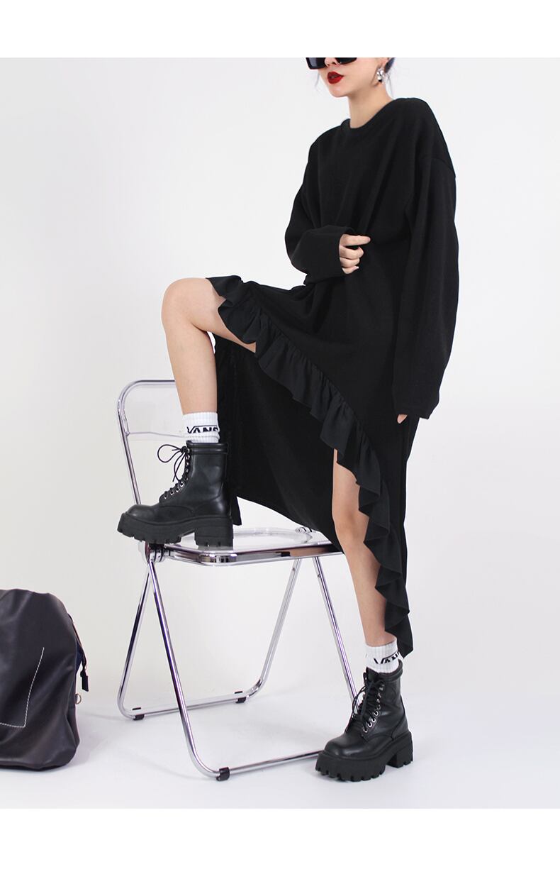 アシメントリーフリルワンピース フリルワンピース 不規則デザインワンピース ルーズ ワンピース ドレス レディース モード系 オフィスコーデ ママコーデ オシャレ 2カラー a4567
