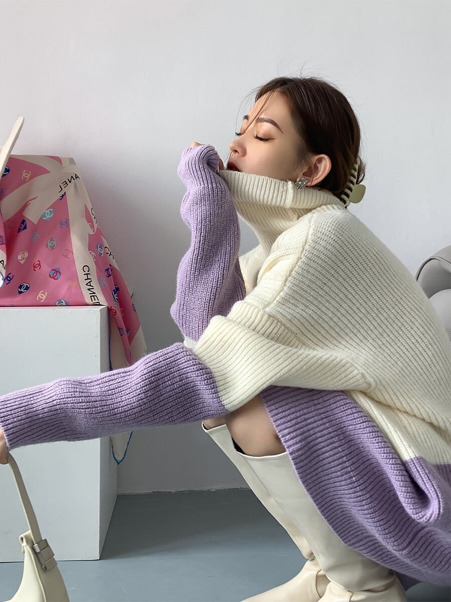 バイカラーセーター タートルネックセーター レディース 秋冬 ルーズ プルオーバー コントラストカラー ニット セーター ニットワンピ 可愛い オシャレ D259