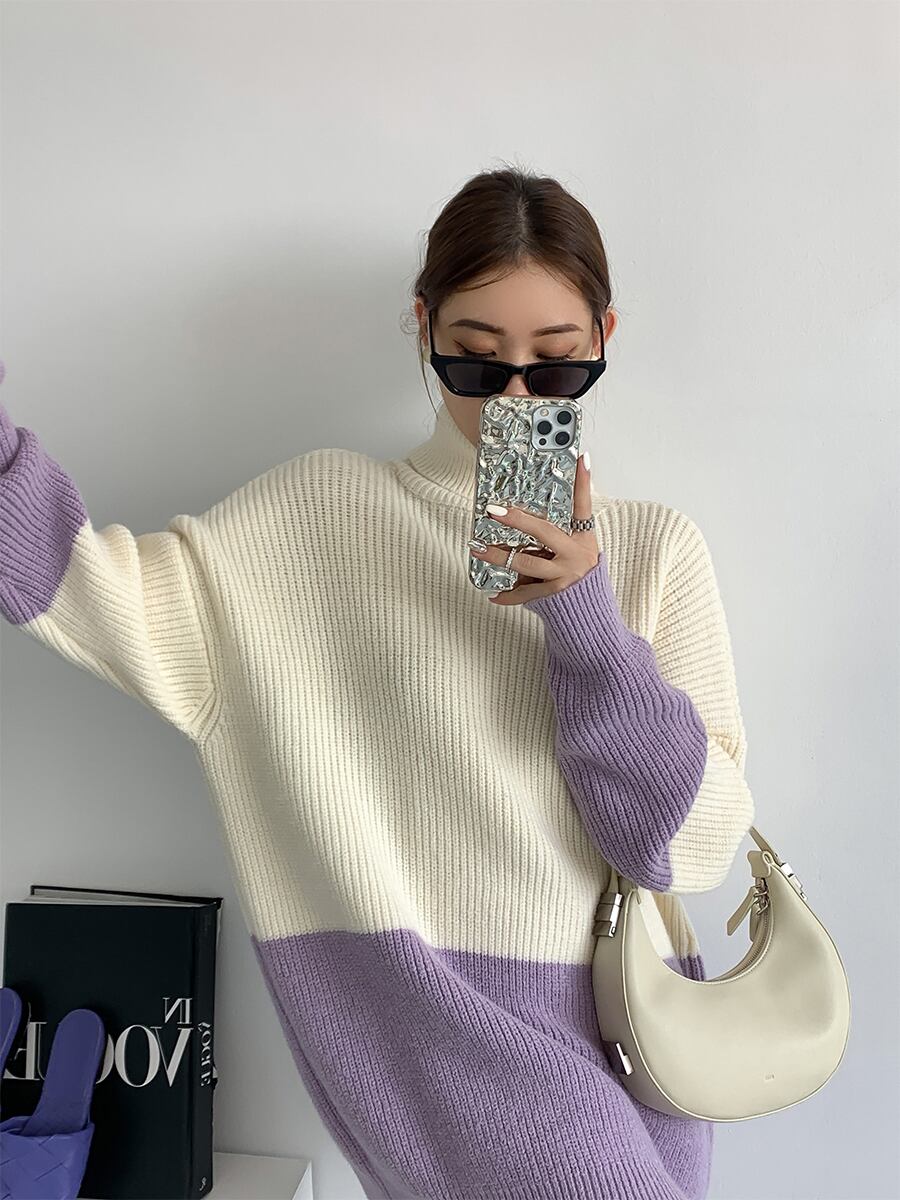 パープル×ホワイトのバイカラーが可愛いプルオーバーニット