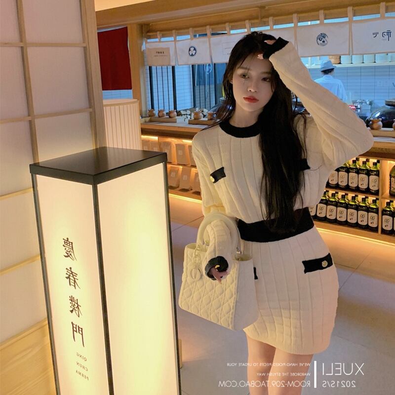 【セットアップ】ワッフル風 長袖セーター+ニットスカート