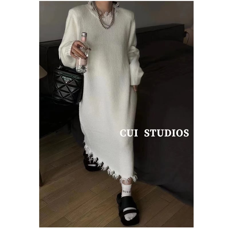 フリンジ付きセーターワンピース ニットワンピース ラウンドネック 韓国 ゆったり ストレート 秋冬 ロング丈 レディース ニット セーター ワンピース ドレス 4カラー D293