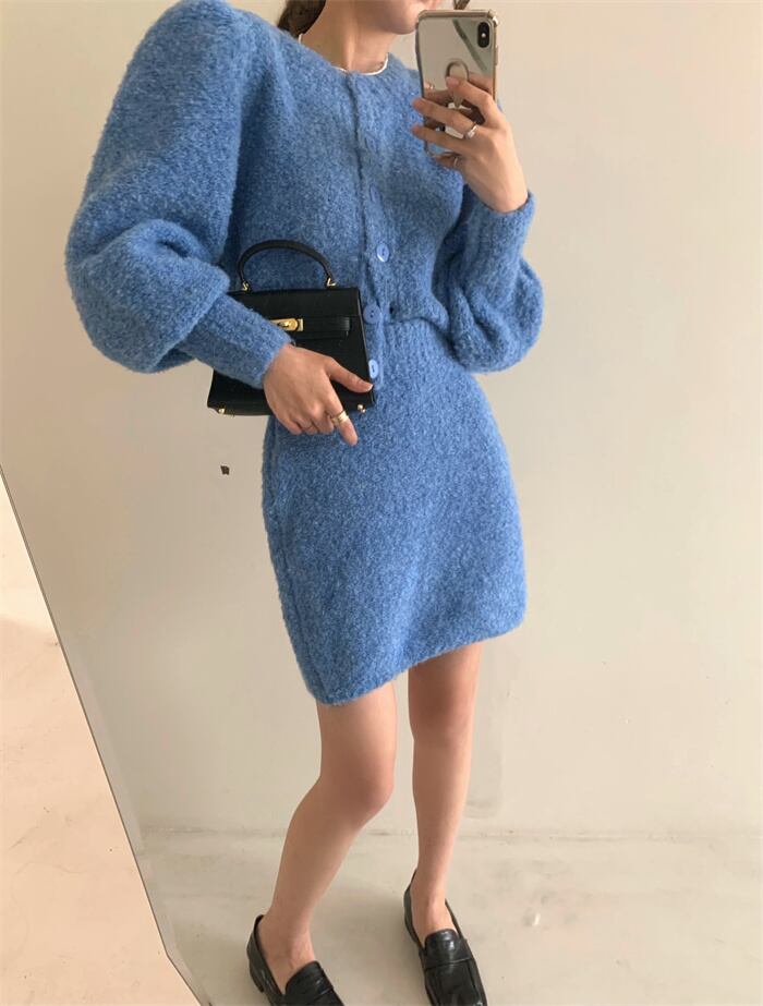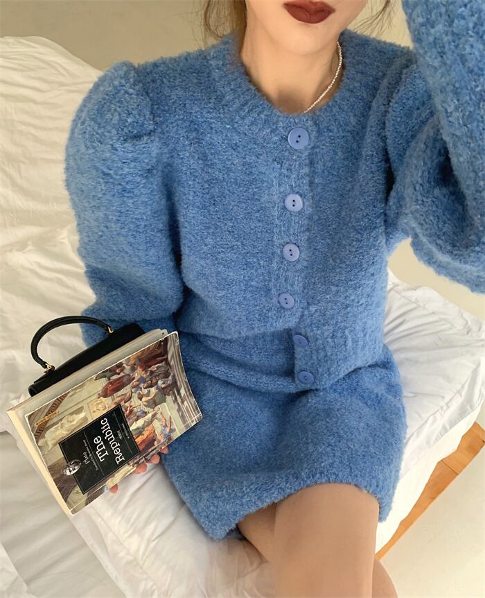 【セットアップ】ニットカーディガン+ニットスカート set up ニットアップ 上下セット 2点セット ニット カーディガン ミニスカート ハイウエスト ふわふわ 韓国コーデ オルチャン レディース 2カラー D376