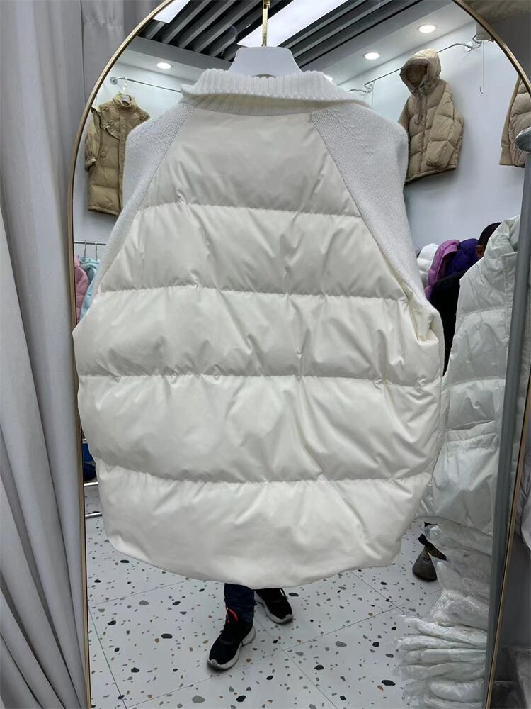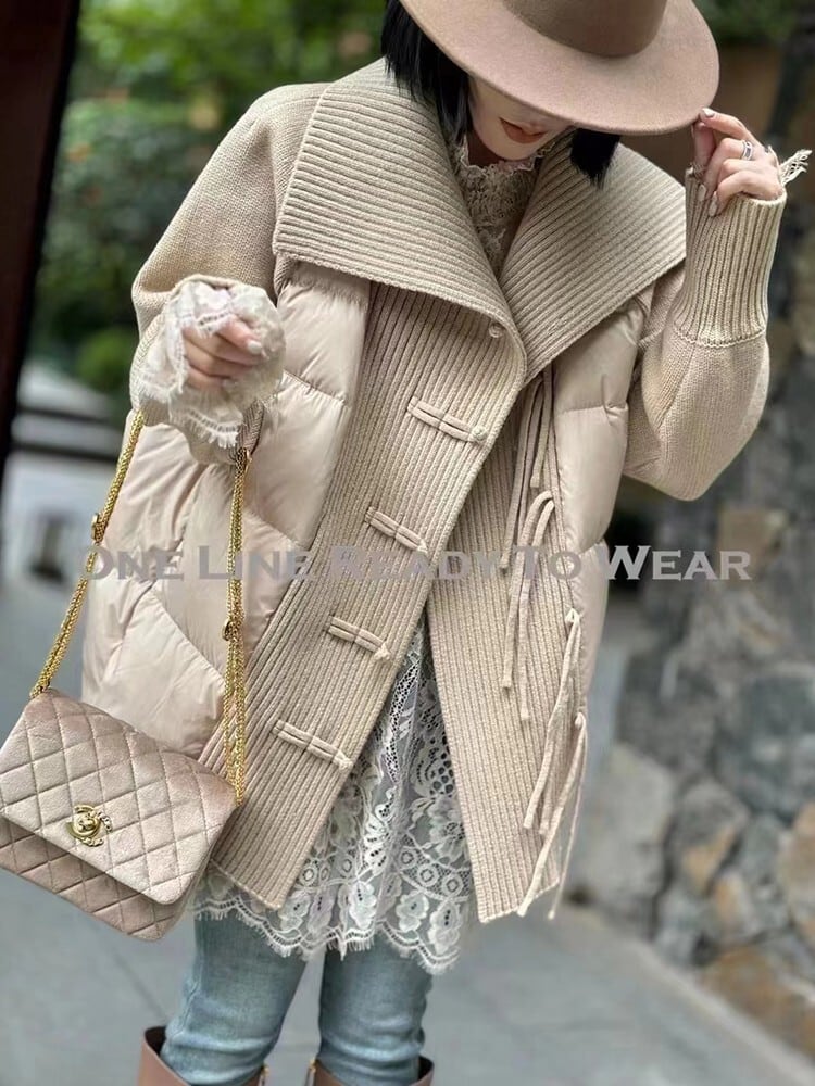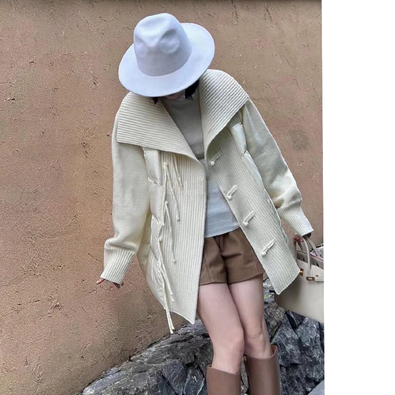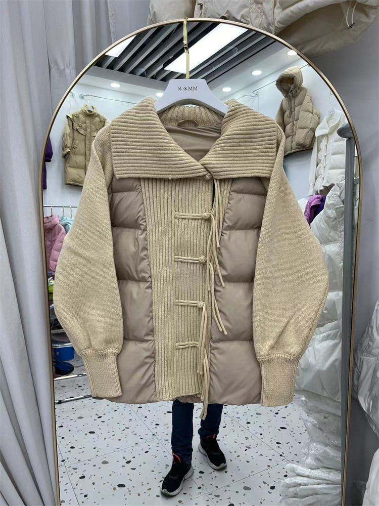 異素材MIXダウンジャケット ニットステッチ タッセルバックル ダウンジャケット ホワイトダックダウン ダウンコート ジャケット コート アウター レディース ルーズ モード系 大人上品 カジュアル D322