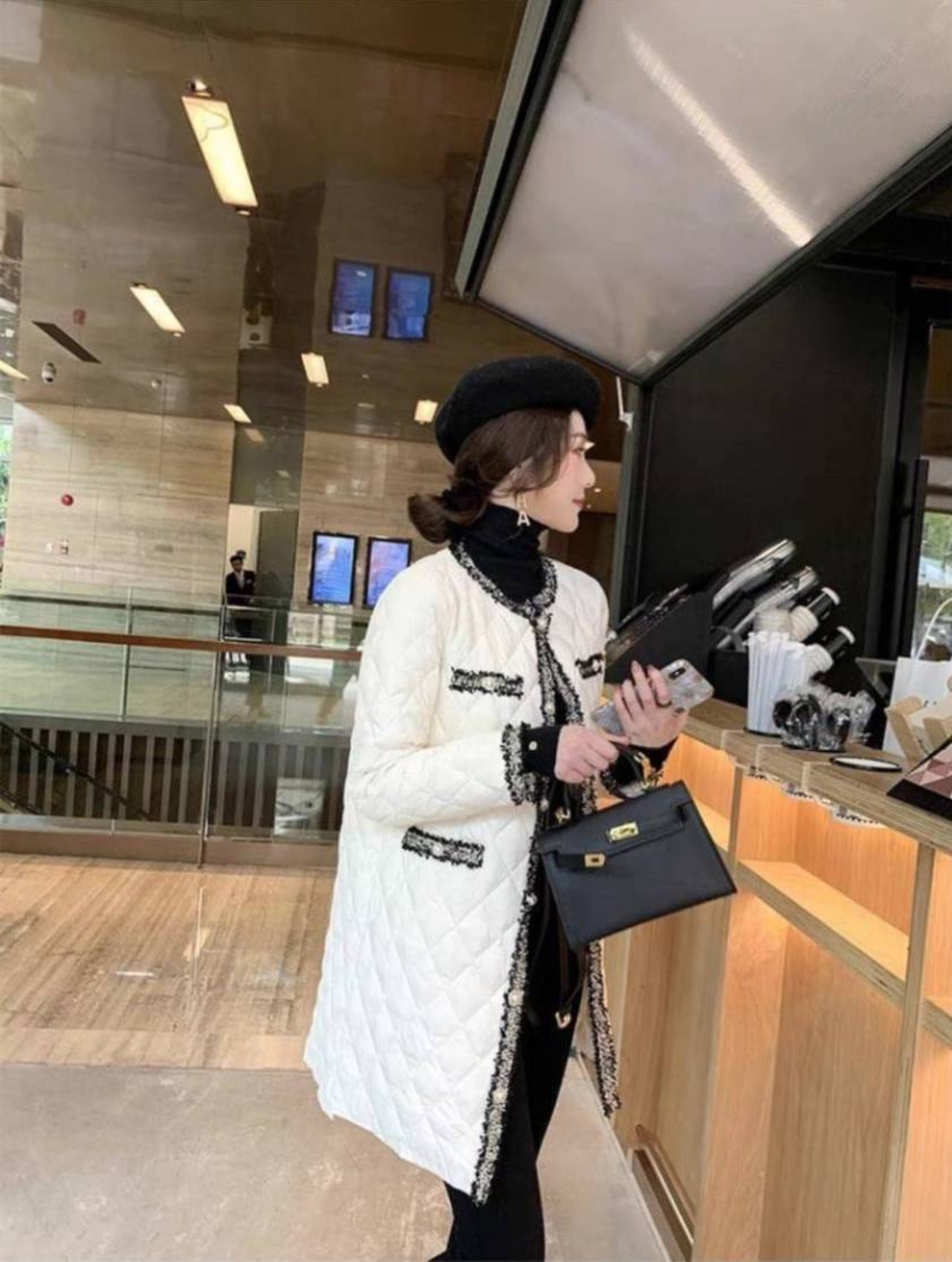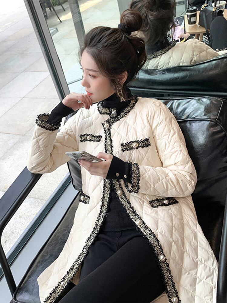 ツイード ロング ジャケット コート パールボタン ノーカラー レディース コート アウター ジャケット ミディアム丈 キルティング ツイード ミドル丈 無地 可愛い おしゃれ きれいめ シンプル ブラック ホワイト 2カラー D396