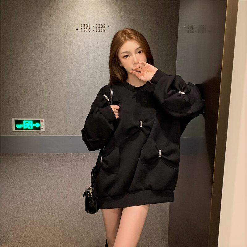 リボン付きプルオーバースウェット トレーナー ボリューム袖 リボンビジュー ミディアム丈 トップス レディース ラウンドネック 長袖可愛い 2カラー C286