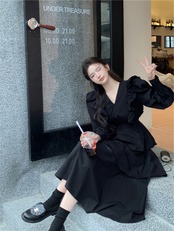 Vネックフリルワンピース フリルワンピース 長袖ワンピース フリル ティアードワンピース ワンピース ドレス. レディース 可愛い ブラック 大人可愛い a4582