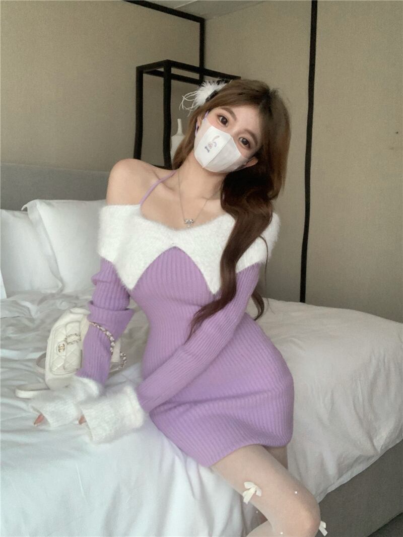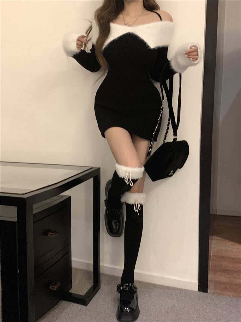 ミニニットワンピース オフショルダーワンピ バイカラーワンピ ニットワンピ. ミニワンピース レディース ワンピース ドレス セクシー. 可愛い 3カラー D420